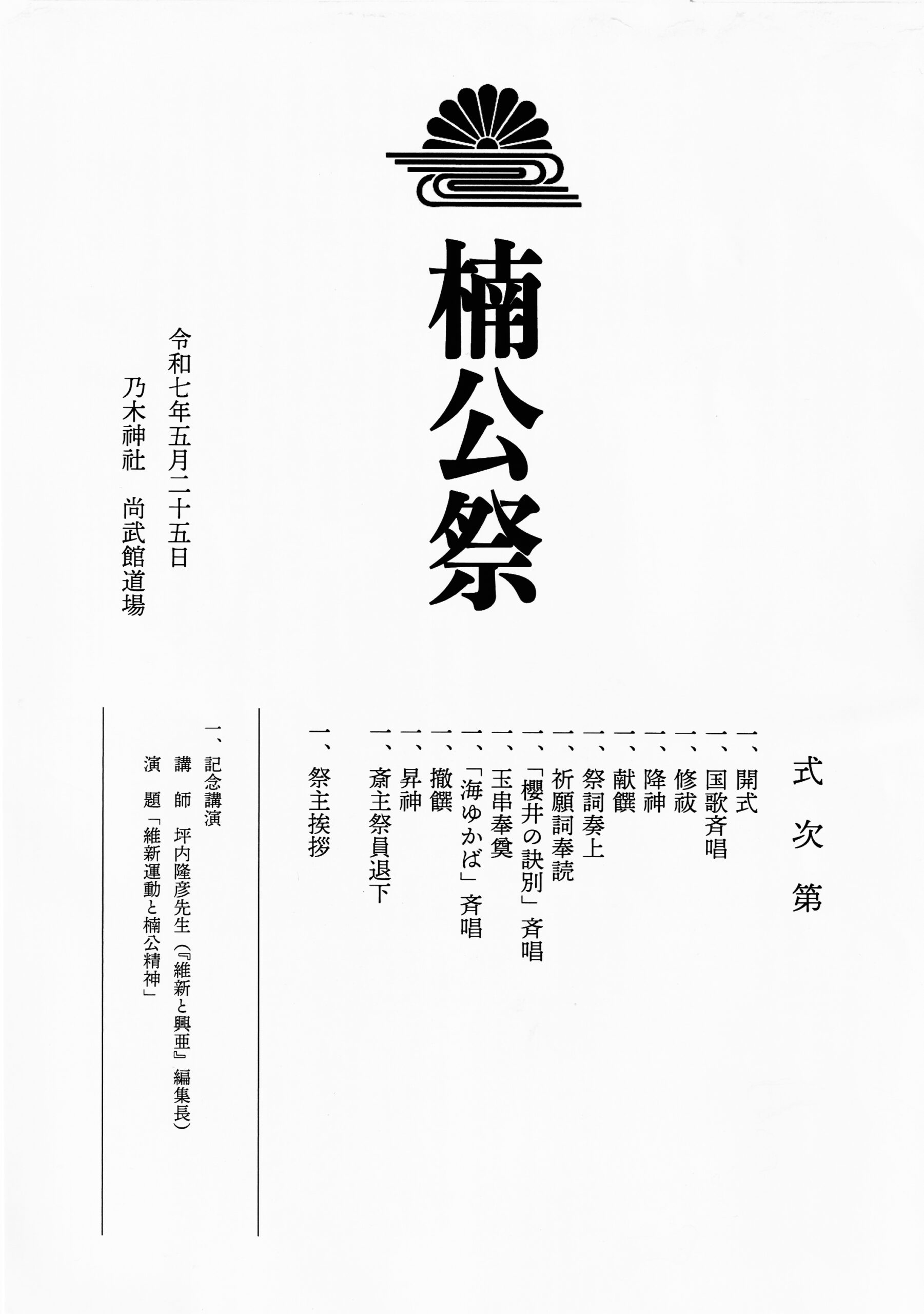 令和七年五月二十五日に、犬塚博英氏を祭主として「楠公祭」が乃木神社で斎行された。