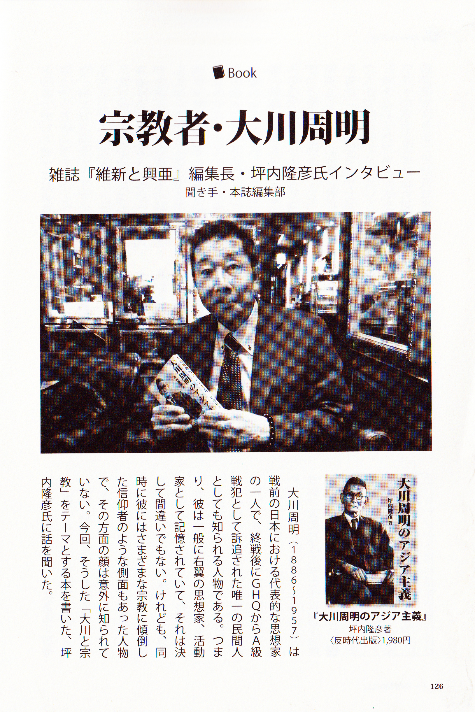 『大川周明のアジア主義』 『大川周明のアジア主義』インタビュー(「宗教者・大川周明」『宗教問題』52号、令和七年 Winter) 2025年12月22日 tsubouchi コメントする 大川周明 (1886~1957)は戦前の日本における代表的な思想家の一人で、終戦後にGHQからA級戦犯として訴追された唯一の民間人としても知られる人物である。つまり、彼は一般に右翼の思想家、活動家として記憶されていて、それは決して間違いでもない。けれども、同時に彼にはさまざまな宗教に傾倒した信仰者のような側面もあった人物で、その方面の顔は意外に知られていない。今回、そうした「大川と宗教」をテーマとする本を書いた、坪内隆彦氏に話を聞いた。