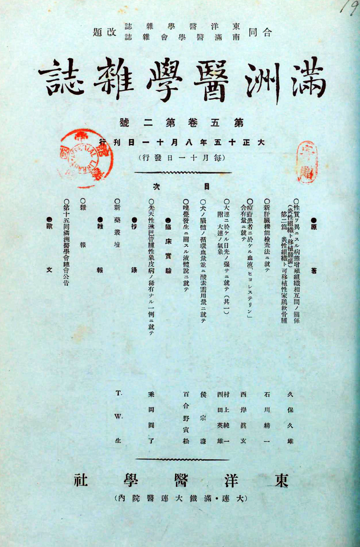 満鉄大連医院内に置かれた「東洋医学社」が発行していた医学専門誌が、『満洲医学雑誌』である。西田が大連で医学の発展に重要な役割を果していたことは、度々同誌に医学論文を載せていたことからも明確だ。例えば、同誌第四巻第三号には「心臟瘤ニ就テ」を発表している。また、同誌第五巻第二号には、村上純一とともに「大連ニ於ケル日光ノ強サニ就テ(其一) 附 大連ノ氣象」を寄せている。