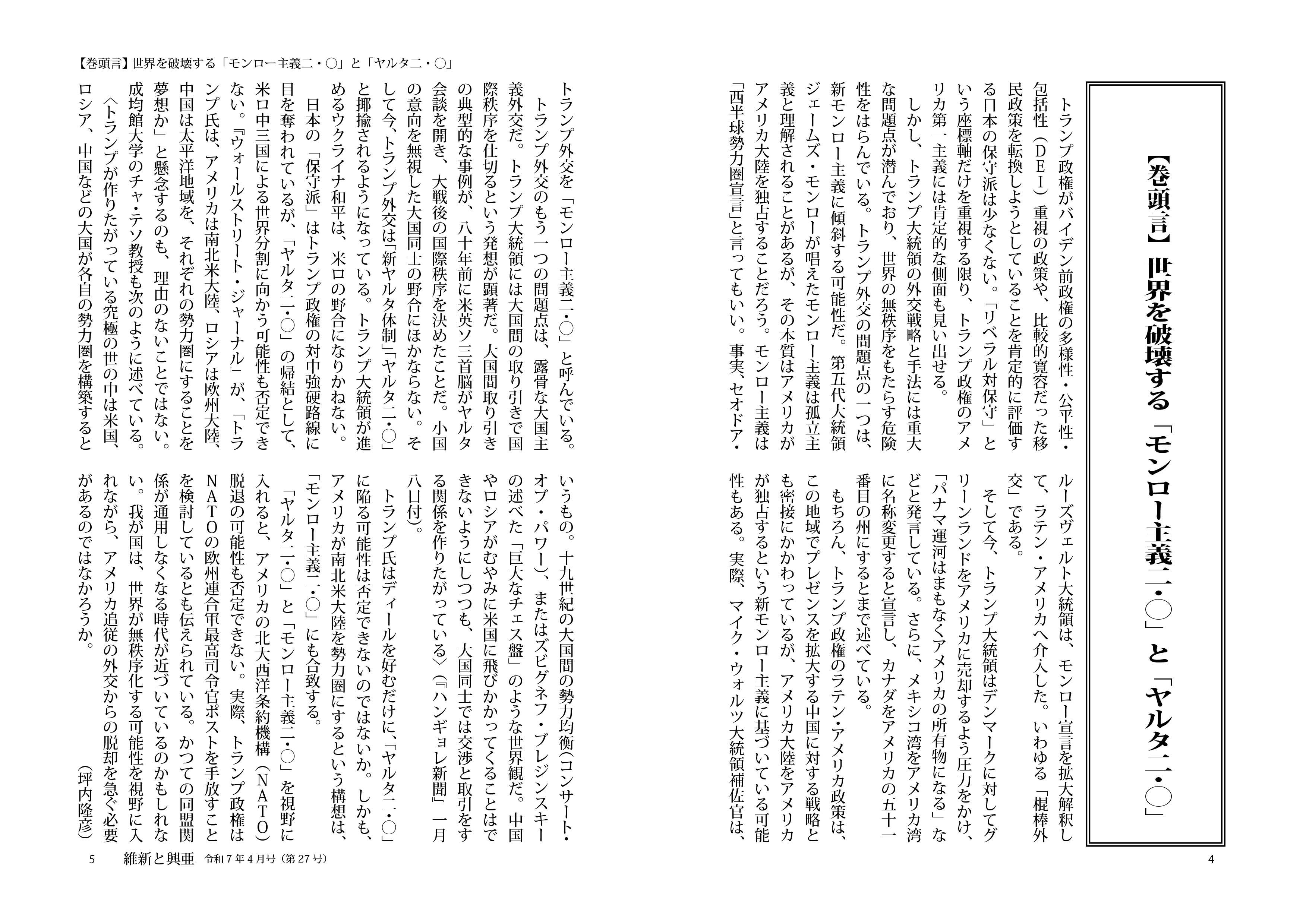「ヤルタ二・〇」と「モンロー主義二・〇」を視野に入れると、アメリカの北大西洋条約機構(NATO)脱退の可能性も否定できない。実際、トランプ政権はNATOの欧州連合軍最高司令官ポストを手放すことを検討しているとも伝えられている。かつての同盟関係が通用しなくなる時代が近づいているのかもしれない。我が国は、世界が無秩序化する可能性を視野に入れながら、アメリカ追従の外交からの脱却を急ぐ必要があるのではなかろうか。